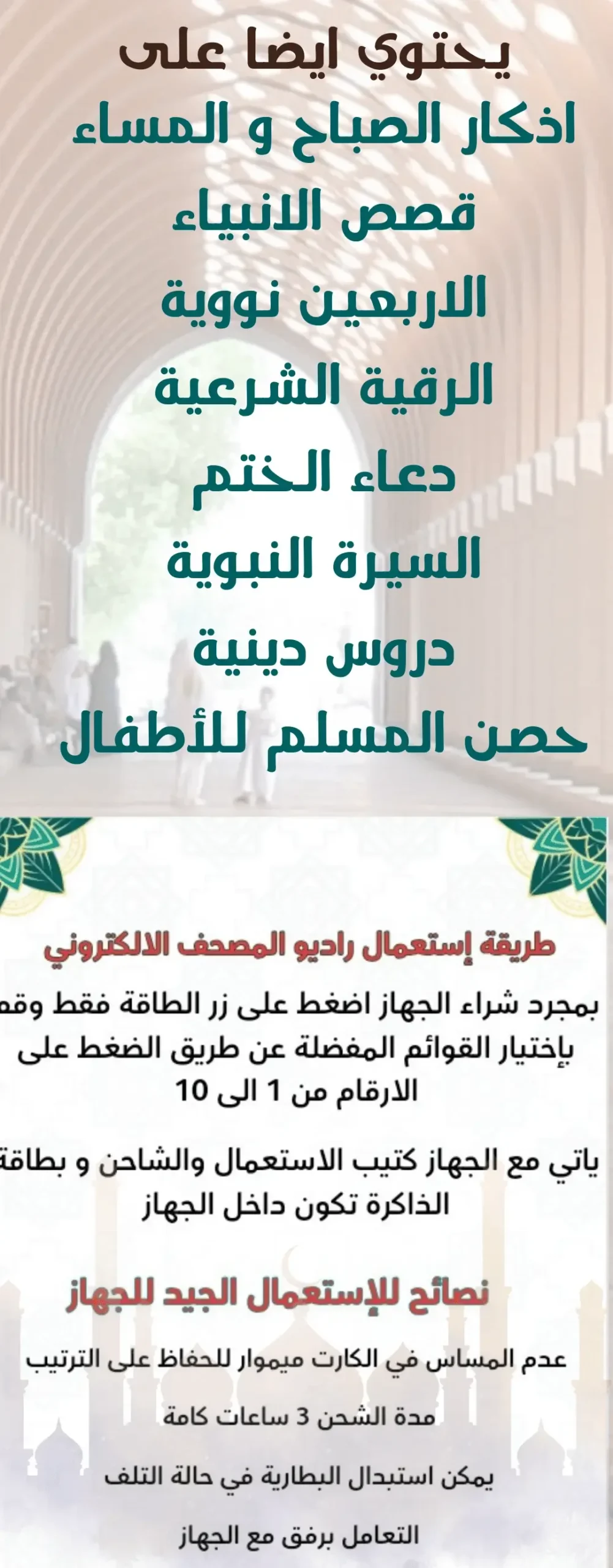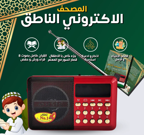راديو المصحف الإلكتروني الناطق: جهاز محمول يحتوي على القرآن الكريم كاملاً بأصوات 8 قراء مشهورين، قصار سور للأطفال، سيرة نبوية، قصص أنبياء، أذكار صباح ومساء، رقية شرعية، ودعاء ختم.