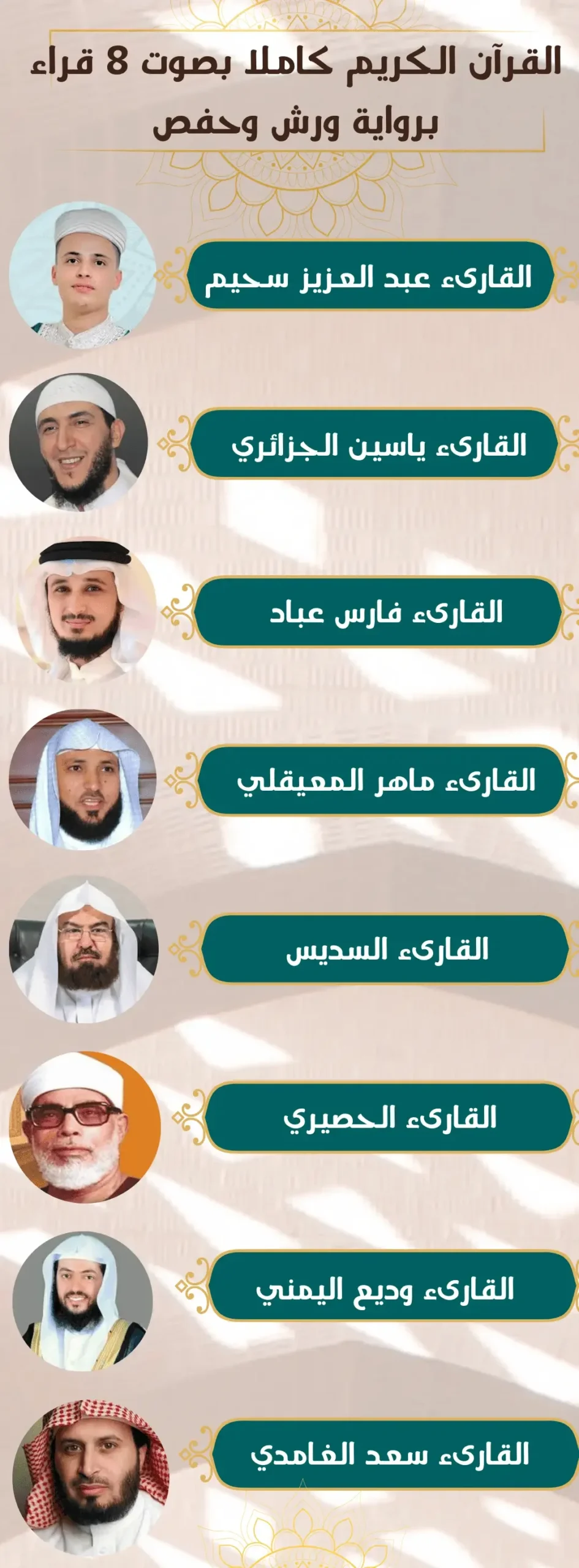 راديو المصحف الناطقالقرآن الكريم المحمول بأصوات 8 قراء مشهورين.